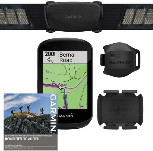 Balení obsahuje cyklopočítač, předsazený držák, držák na řídítka snímač kadence, rychlosti, tepu a Topo Czech.