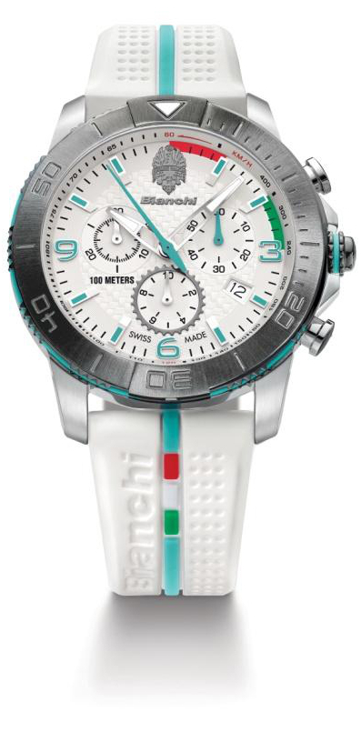 Pro ortodoxní vyznavače značky Bianchi máme k dispozici luxusní hodinky v designu Bianchi Swiss Made Chronograph BIANCHI Průměr: 43 mm Materiál: leštěná / satin nerez ocel Sklo: safírové odolné proti poškrábání Strojek: švýcarský Quartz Ronda 5040 Funkce: Datum okno ve 4 hodiny, chronograf 1/10 sekundy, stopky Řemínek: pevná guma přezka Záruka: 2 roky (mezinárodní) Odolnost proti vodě: 100 m (10 ATM / 330 stop) Hodinky mají speciální balení - lahev Bianchi Pokud budete chtít hodinky obejdnat informujte se na info@bikeinvest.cz nebo 725974736, většinou máme vzorek skladem.