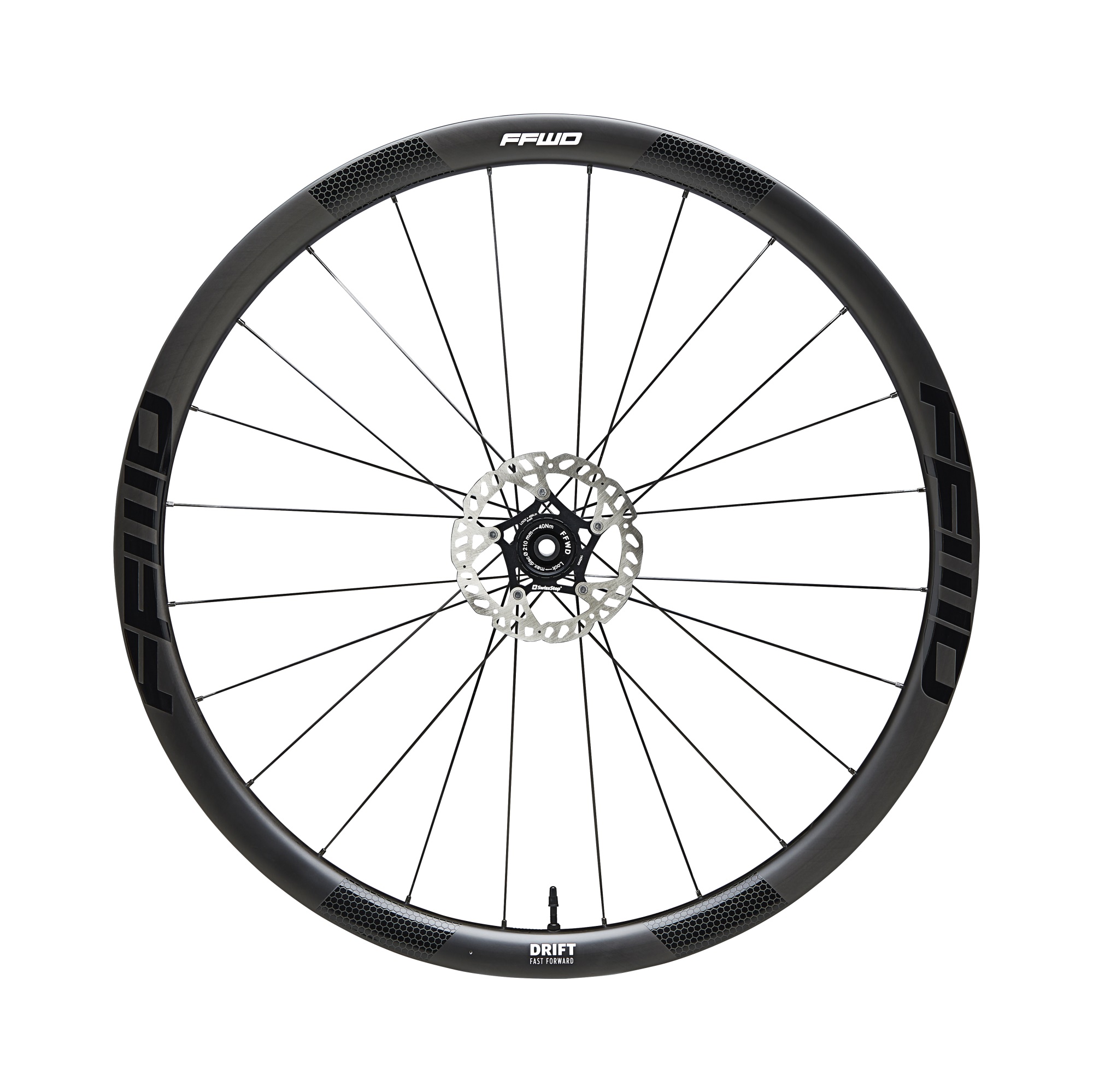Model DRIFT je prvním z nové řady kol FFWD určených speciálně pro gravel a off road ježdění. Vývoj se zde zaměřil na trochu odlišné parametry než u podobných silničních kol. Váha zde musí jít ruku v ruce s tuhostí a hlavně odolností ráfku a výpletu. Ráfky byly proto sepciálně vyvinuty tak, aby dokázaly pojmout široké pneumatiky a odolaly nejen nárazům od nich, ale také kamenům odvalujícím se přes ráfek. Karbon je u těchto ráfků napleten odlišným způsobem a dělá je mnohem odolnějšími. Pro výplet byly zvoleny nejodolnější aerodráty od DT Swiss - konkrétně model Aerocomp. Samozřejmostí je použití mosazných niplů, které zejména v off road aplikacích výrazně zvyšují životnost výpletu (hliníkové niple se brzy vymačkají a rychle korodují). Vše je zapleteno na nábojích DT Swiss 240 s novým patentovaným systémem ořechu EXP, a to v poměru drátů 2:1. Dohromady tvřoí tyto komponenty kola, na která se v terénu můžete spolehnout a zároveň Vás svými vlastnostmi přímo vystřelí vpřed.