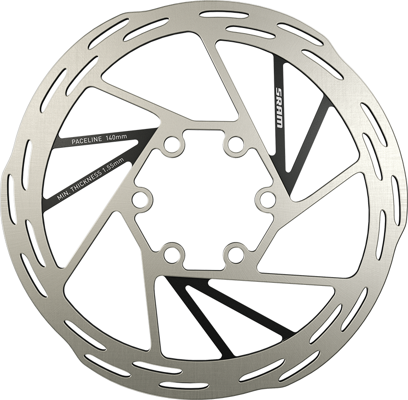 Brzdové kotouče Paceline doplňují elegantní design elektronických sad SRAM eTap AXS a jsou vybavené novou brzdovou plochou s otvory pro výkonné, hladké a tiché brždění.