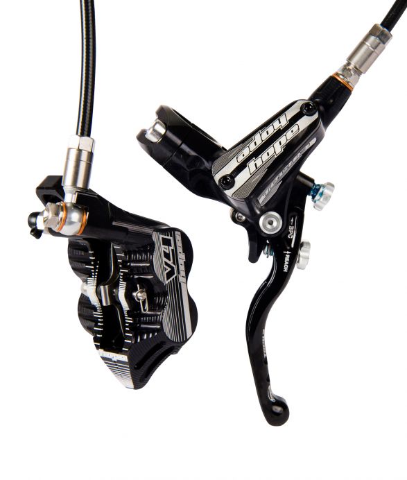 "TECH3 V4" 4-pístkový sjezdový speciál, otevřený systém, 320g. "Tech3" páka umožňuje nastavení vzdálenosti páky od řídítek a destiček od kotouče. Montáž kotoučů 203 mm Floating a "Vented" Floating s vnitřním chlazením, který vykazuje o 25% lepší chlazení než standardní Floating kotouč. Tech3 páka + V4 brzdič (černé) s opletenou hadicí (90/150mm), odvzdušněný systém.