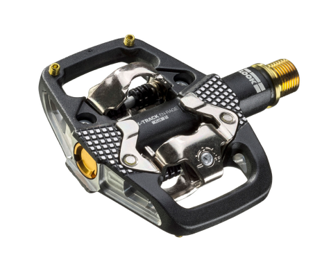 Pedál LOOK X-Track En-Rage Plus má kované hliníkové tělo, které zajišťuje neuvěřitelnou pevnost, a je kompatibilní se systémem SPD. Je vybaven titanovou osou, která zvyšuje pevnost a tuhost, zároveň šetří gramy. Má 67 mm širokou platformu a 664 mm2 kontaktní plochy. To zajišťuje lepší stabilitu a oporu, zejména při vysokých rychlostech. Čepy a žebrování těla pedálu zajišťují přilnavost za všech okolností. Konstrukce modelu byla navržena na základě robustního vřetena a ložiskového mechanismu. Ten je odolný vůči poškození vnějšími vlivy (kameny, kořeny, bláto atd.). Boční kontaktní opora vede nohu při hledání pedálu a poskytuje kontaktní bod, i když se bota ještě nezacvakla. Tato široká kontaktní plocha zabraňuje klouzání nohy po těle pedálu a nabízí konzistentní a jistou oporu. Model X-Track En-Rage Plus Ti dokonale vyhovuje požadavkům enduro jezdců.