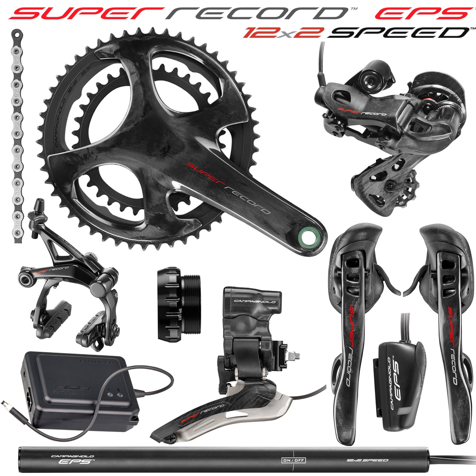 Sada EPS Super Record 12x2 s ráfkovými brzdami je v současné době nejlehčí sériově vyráběnou elektronickou sadou na světě, která nabízí kombinaci 12-ti stupňového pastorku s dvojpřevodníkem. Nová baterie V4 nabízí též bezkonkurenční dojez až 2.200 km na jedno nabití.